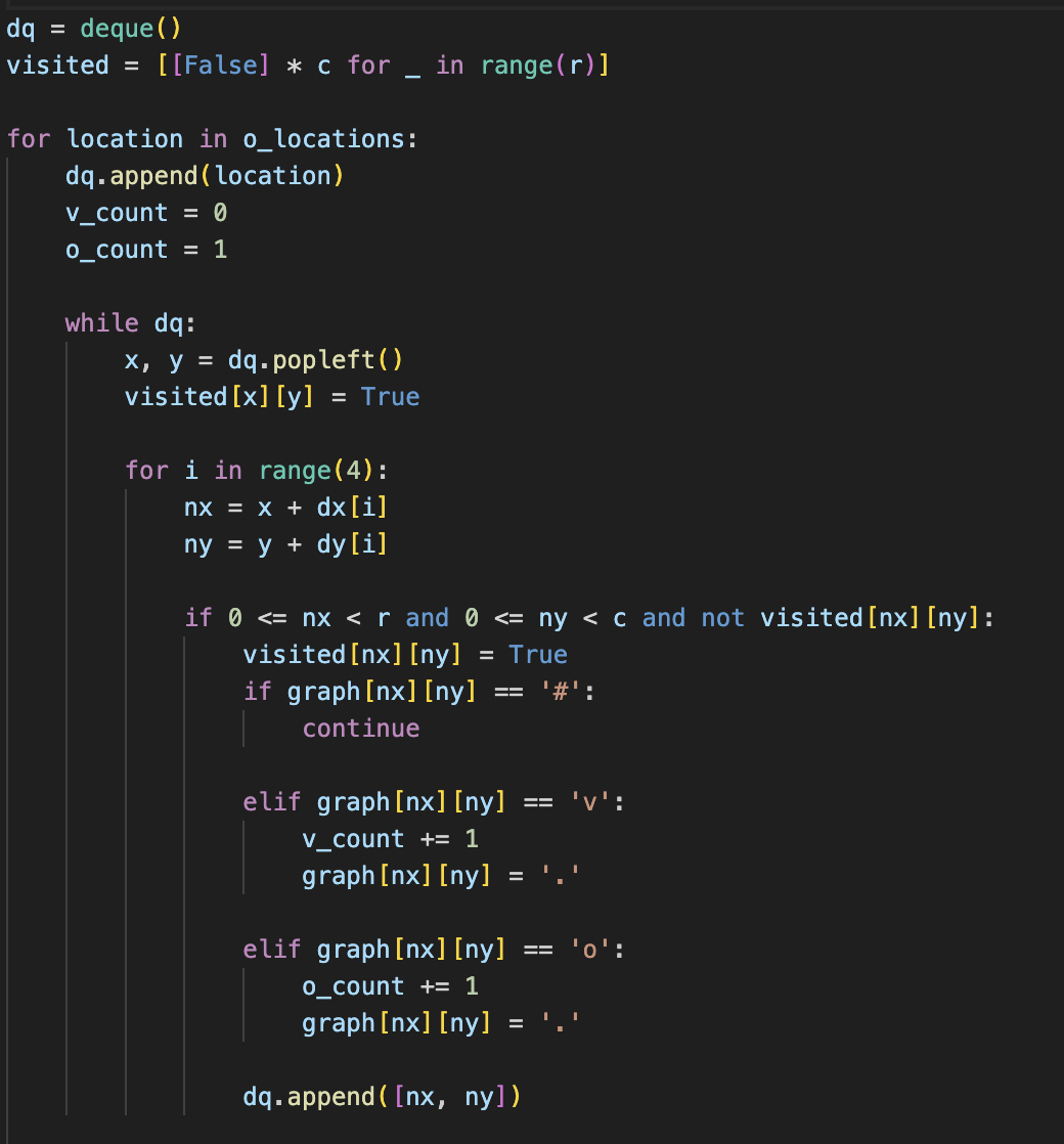 3. 탐색을 시작한다. 탐색 지점이 #인 경우, v인 경우, o인 경우를 각각 나누어서 생각해 주어야 한다. '.'인 경우는 큐에 무조건 추가할 것이기 때문에 따로 생각해주지 않았다.